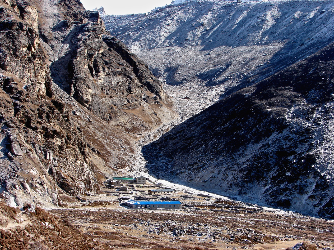 the lodges of Dragnag and the trail from Cho La tumbling down to them – a snapshot taken the next morning after moving on towards Gokyo
