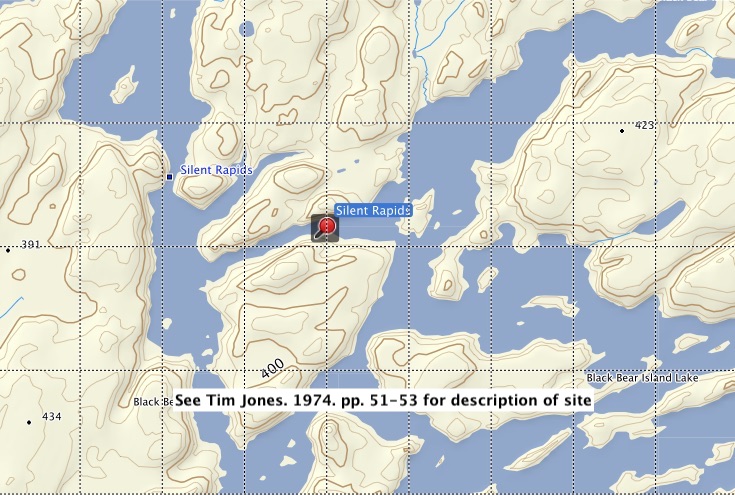 map; Jones report; The location on the map is based on Jones GPS coordinates. It is actually on the other side of the narrows to the west of Site #2. See here for Jones’ 1974 description of the two sites in this area.