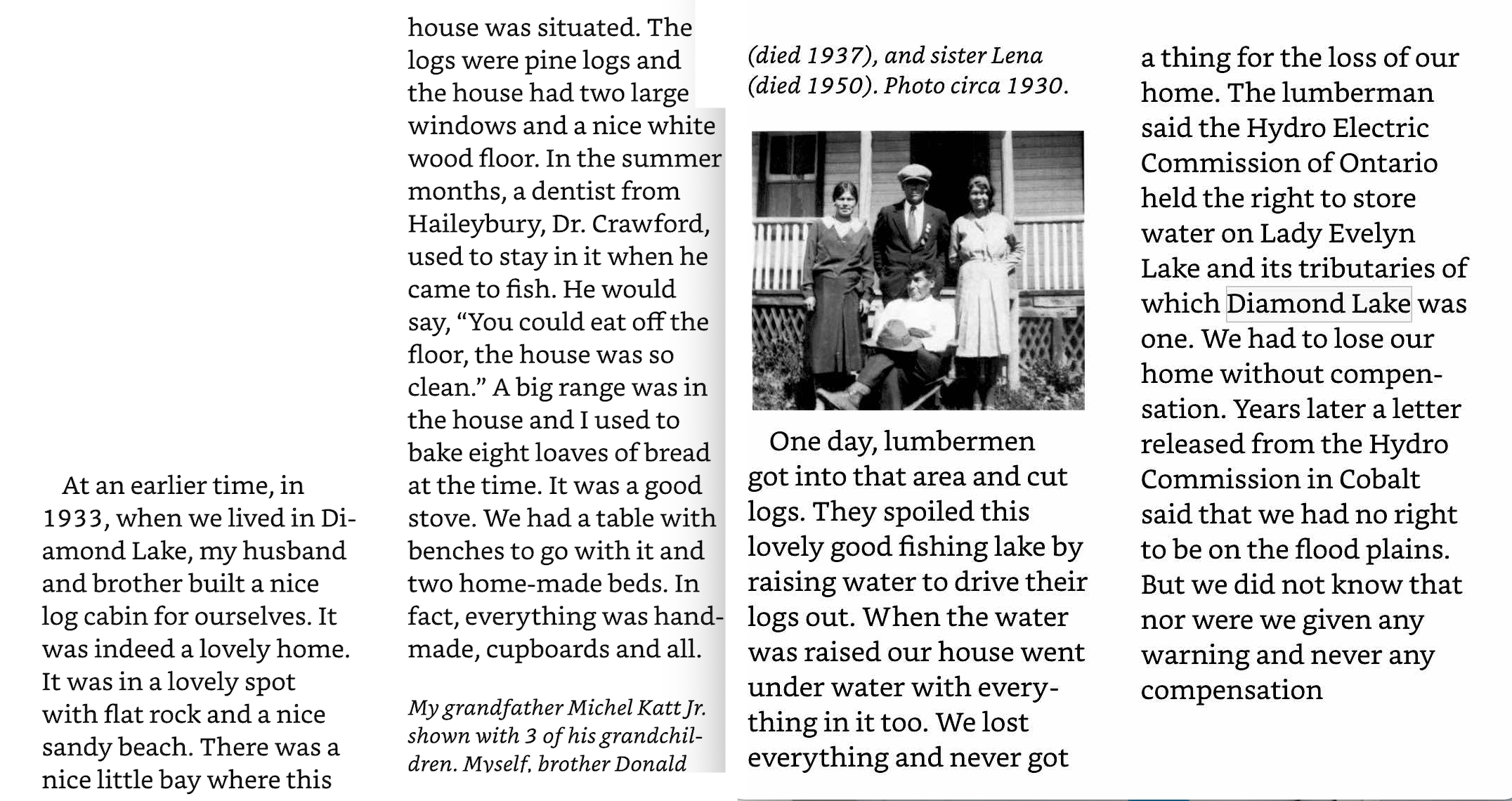 A 2004 document – Temagami First Nation Report On Water Management Planning For the Montreal and Matachewan Rivers – includes a testimonial statement attributed to Theriault. She died in 2000; the testimonial is borrowed from an earlier report. It does provide an account that sounds more factual than the one above: